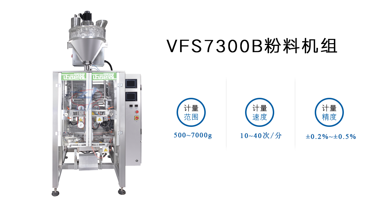 VFS7300B粉料機組由CJL5000螺旋計量機和一臺VFS7300立式充填包裝機組組成,特別適宜較大粉塵的細粉狀物料的計量包裝。集計量、制袋、包裝、封口、打印、計數(shù)于一體,配有先進料位開關(guān),可以增加安裝除靜電裝置并附吸塵裝置。有效地解決了粉塵全自動包裝的難題。
