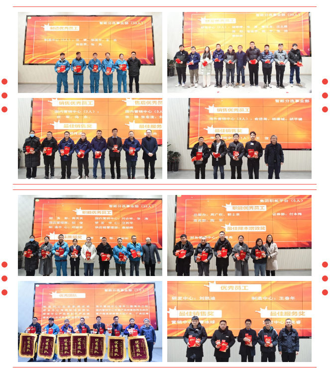2月1日,以“穩(wěn)增長、謀突破、聚共識、 拼實干”為主題的泰禾智能集團2024年新春大會在總部隆重召開。集團總裁魏先彪、智能分選事業(yè)部總裁石江濤、集團財務經營中心總監(jiān)黃慧麗及各業(yè)務線管理層、優(yōu)秀員工代表薈聚一堂,共同回首2023,展望2024。董事長許大紅線上參會。