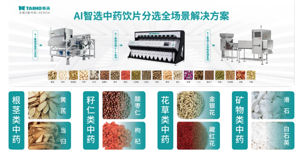 泰禾AI智選中藥飲片分選全場景解決方案,憑借其卓越的分選能力和穩(wěn)定性,無論是顏色還是形狀,都能輕松識別和分選,顯著提升了傳統(tǒng)藥材分選過程的效率和精確度,滿足包括根莖切片類、籽仁果實類、花草類、動物礦物類等多種中藥材的分選需求,為藥企的生產(chǎn)效率和產(chǎn)品質(zhì)量提供了強有力的保障。