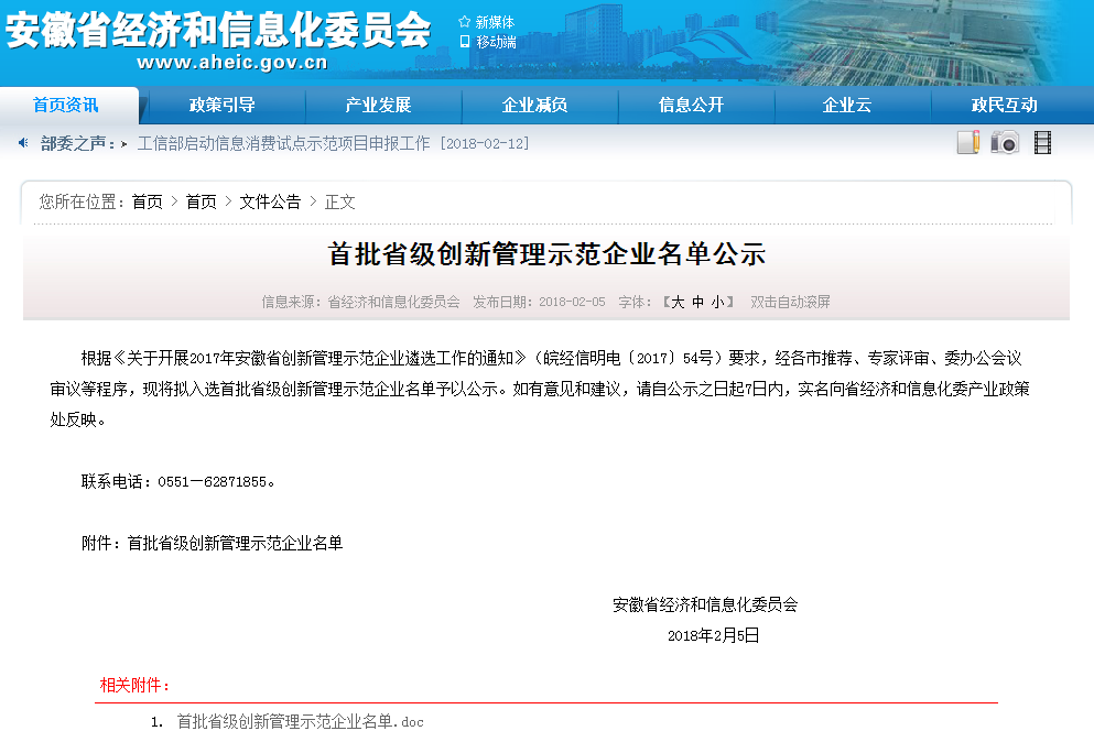 2018年2月5日,安徽省經(jīng)濟(jì)和信息化委員會公布了首批省級創(chuàng)新管理示范企業(yè)名單。泰禾光電成功入選首批省級創(chuàng)新管理示范企業(yè)名單,是行業(yè)內(nèi)唯一一家獲此殊榮的企業(yè)。