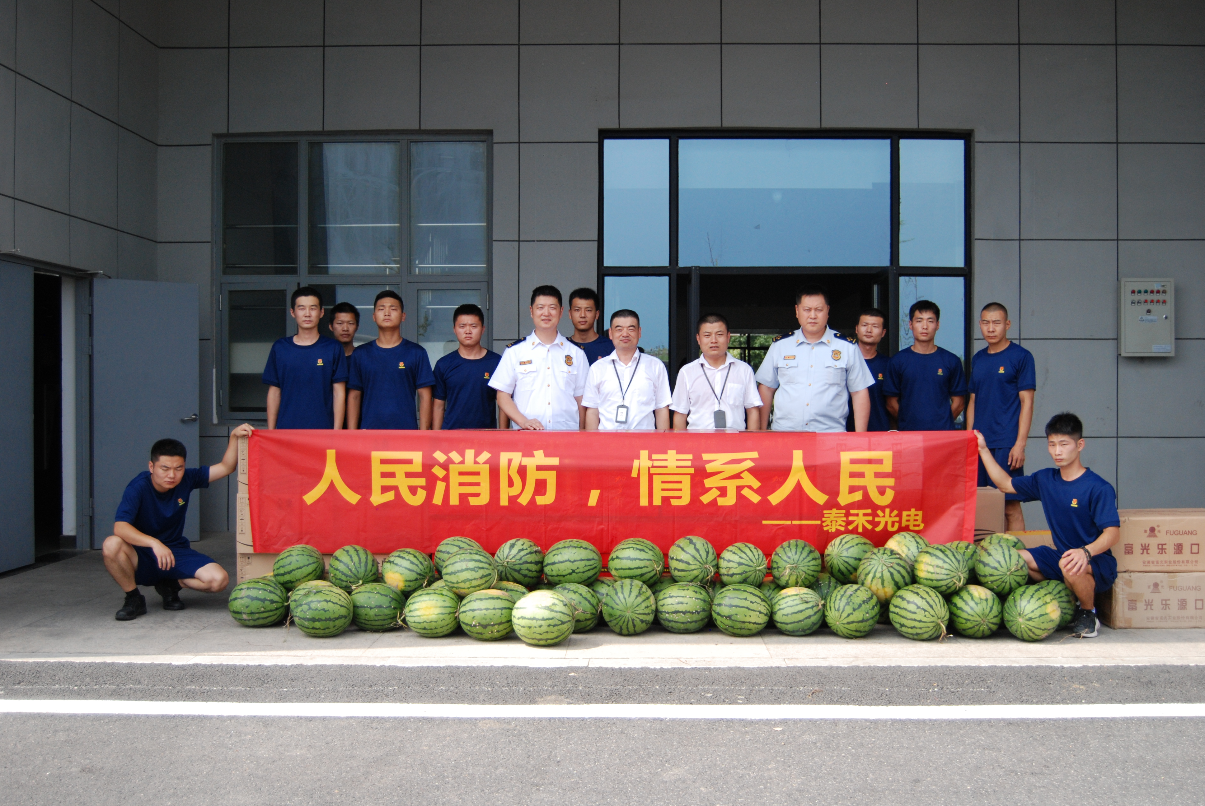 慰問中,董事長助理王成應(yīng)與消防大隊官兵們親切交談,代表泰禾光電送來節(jié)日問候及飲料、西瓜等慰問品。并向消防官兵們保護國家和人民群眾生命財產(chǎn)安全的行為致以崇高敬意。